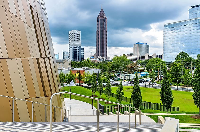 Atlanta the capital and largest city of the US. Designed by Atlanta native John Portman and recognizable by its reflective windows and cylindrical shape the Westin Peachtree Plaza Hotel was the tallest hotel structure in the world when it opened in 1976 and the citys tallest building until 1987. The Westin Peachtree Plaza is located at 210 Peachtree Street and is perhaps the most distinctive tall building on Atlantas pretty skyline.